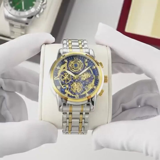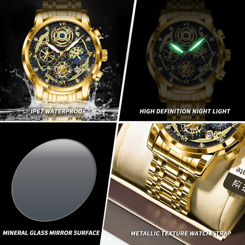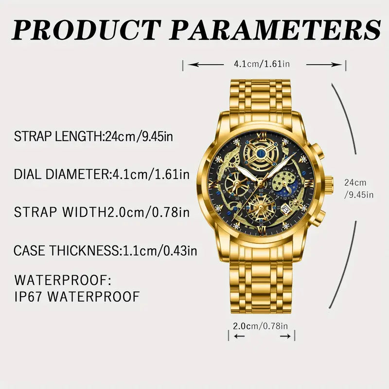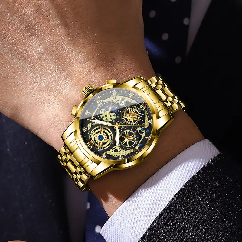 En exklusiv herrklocka som kombinerar lyxig design med funktionell finess. Klockhuset i gyllene ton och länken i rostfritt stål omfamnar en svart urtavla där gyllene detaljer möter synliga mekaniska inslag. Klockans visare lyser i mörker och ger tydlig tidsavläsning även under natten. Med integrerad kalenderfunktion och pålitlig kvartsrörelse är detta en accessoar som utstrålar både elegans och status i varje sammanhang.