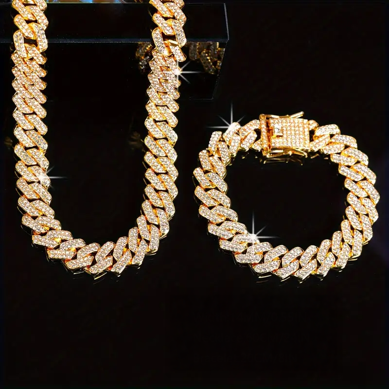 Ett lyxigt tvådelat set med halskedja och armband, tillgängligt i färgerna guldton, silverton och roséguldton. Smyckena är tillverkade i basmetall med en högblank pläterad yta och dekorerade med gnistrande kristaller.