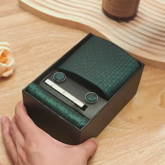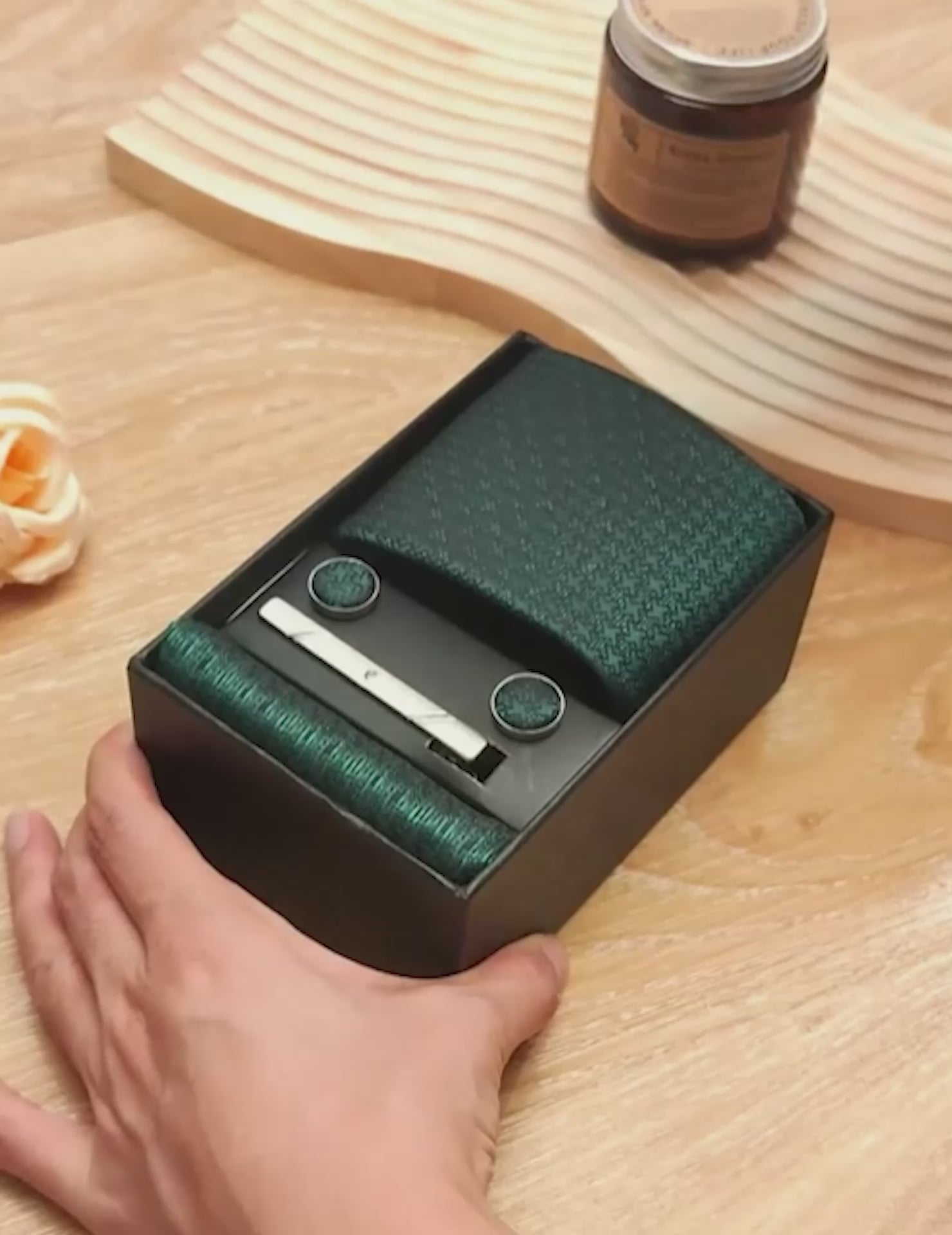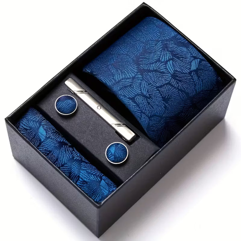 Innehåll: Slips, näsduk, manschettknappar och present ask.