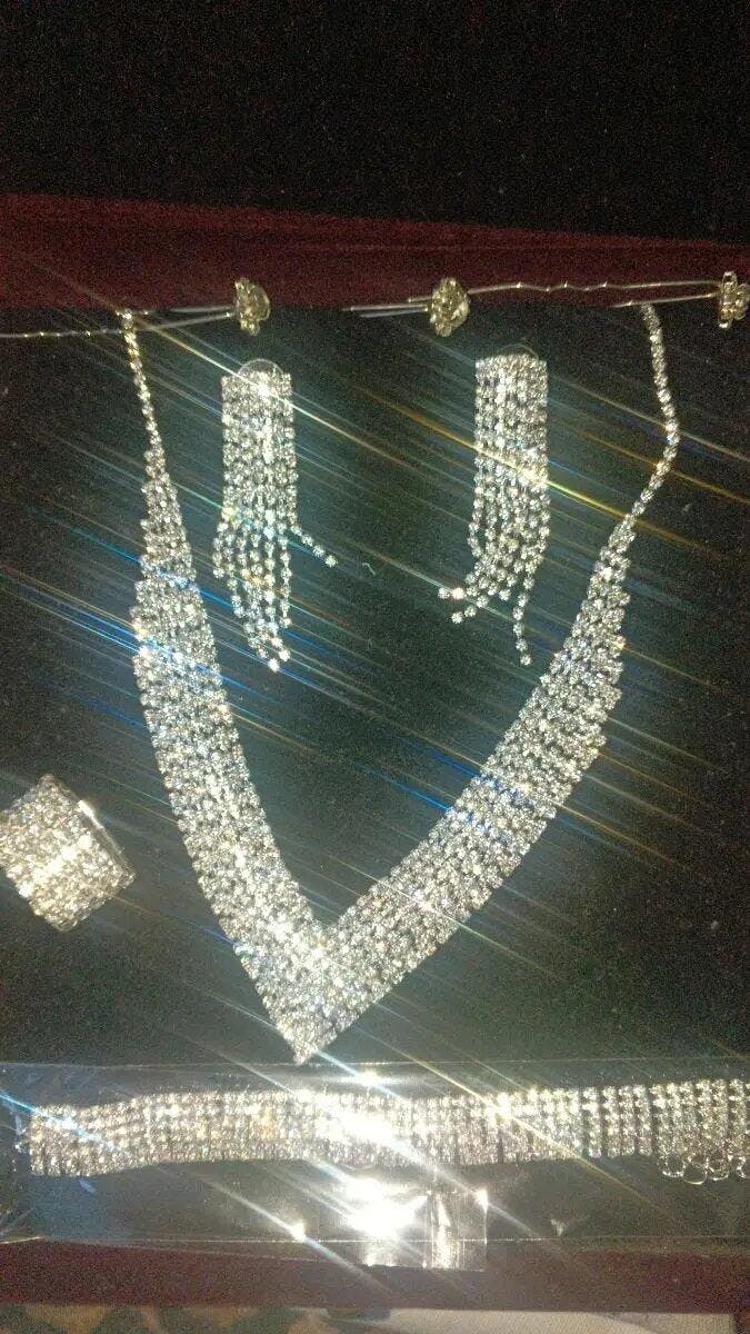 Ett lyxigt smyckeset i fyra delar bestående av halsband, tofsörhängen, armband och ring, dekorerat med glittrande rhinestones och designat med en elegant stil som kombinerar lyx och sofistikation. Setet är tillverkat i koppar med glas som mosaikmaterial vilket ger en skimrande och exklusiv känsla. Det fungerar perfekt som accessoar till festliga tillfällen och är även en uppskattad gåva vid alla hjärtans dag.